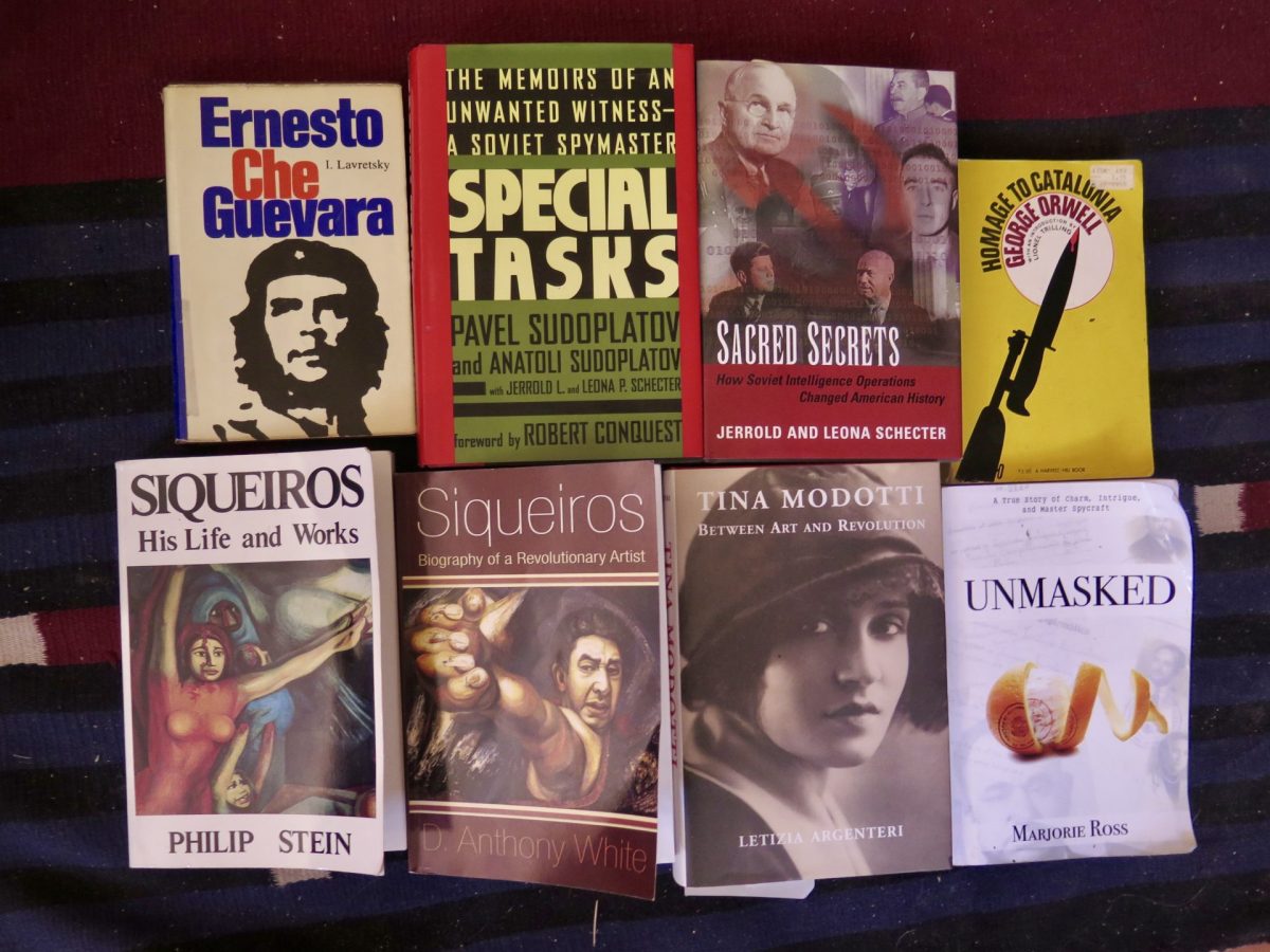 Some of the books about Josif Grigulevich and his missions. The biography of Ernesto “Che” Guevara, lat top left, was written by Grigulevich using the pen name I. Lavretsky.