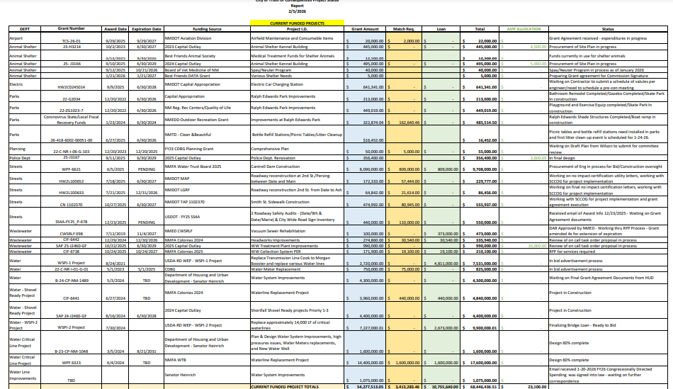 Whitehead pointed out that the city’s nearly $70 million in currently funded projects exceeds Las Cruces’, which has $53 million in capital projects on the books. “And they have two more people in every department,” Whitehead said, highlighting the city staff’s big and ongoing effort to land funding, launch projects and keep up with their administration. Alvarez said each department is conferring and meeting with engineering firms on capital projects in addition to their normal operations work.