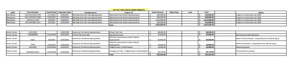 The city is also the fiscal agent for T or C Main Street’s Foch Street project, which is a 100-percent grant of $2.85 million. The city is also the fiscal agent for Sierra Joint Office on Aging’s projects, which are also 100-percent grant funded and total nearly $296,600.